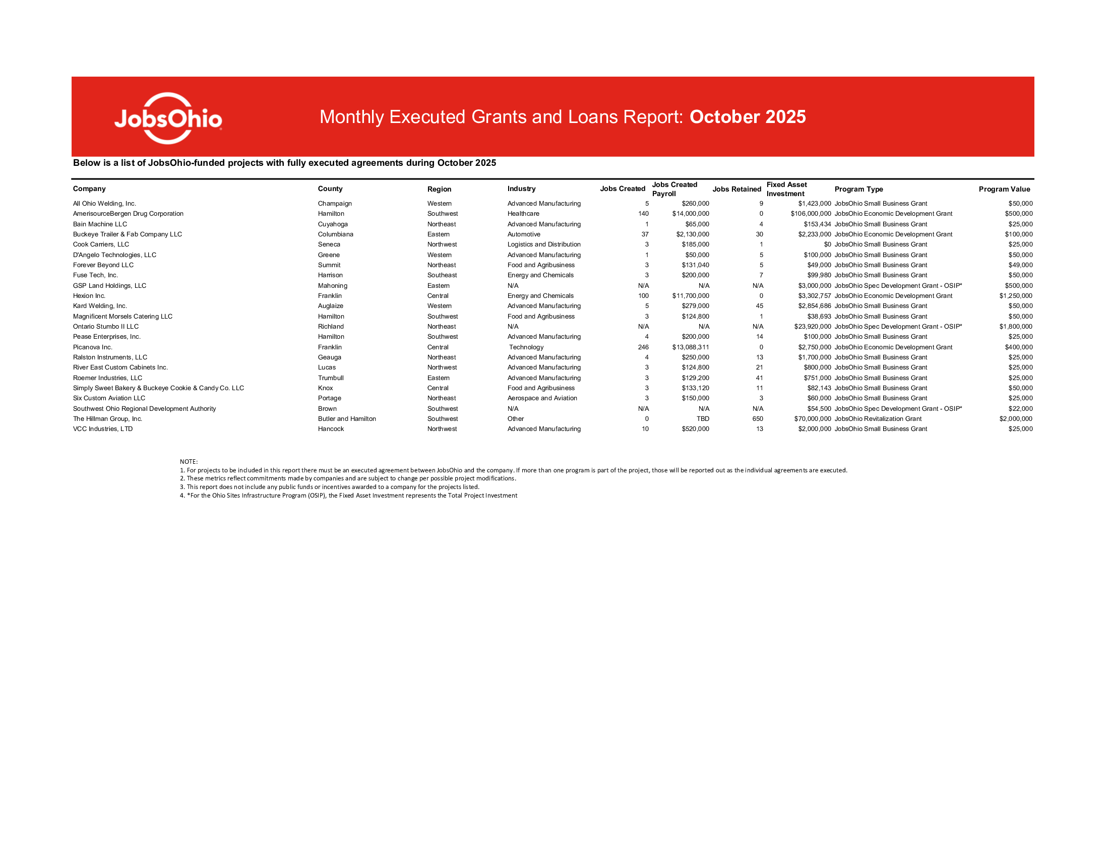 1. For projects to be included in this report, there must be an executed agreement between JobsOhio and the company. If more than one program is part of the project, those will be reported out as the individual agreements are executed.